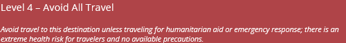 utCurrently there are no level 4 travel advisories for vector-borne diseases.